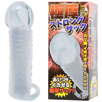 「極厚ストロングサック」があなたの男根を1.5倍に引き締め、イカせまくる快感を味わえます♪肉厚樹脂により感度を鈍らせ、持久力UPはもちろん、カリ高ヘッド・凹凸・イボイボがパートナーをメロメロにします。さらに根元のリングが玉をギュッと締め付け、サックの抜け落ち防止にも一役買っています!極厚ストロングサックで、圧倒的な快感と男らしさを手に入れましょう♪