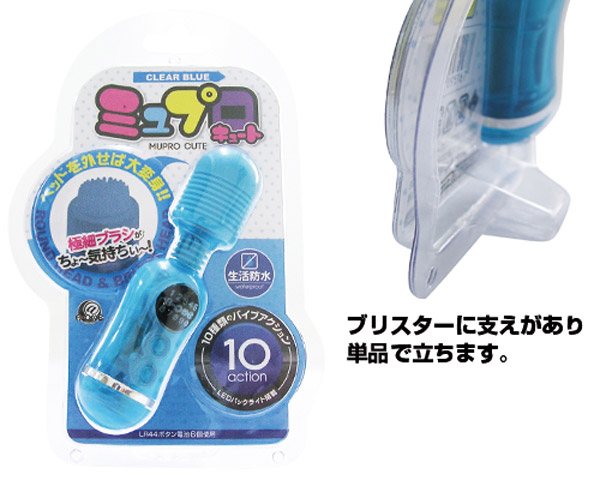 ノーマル&ブラシの2WAY仕様!キュートな多機能ミニ電マ(クリアブルー)。柔らかなタッチを実現したシリコンヘッドは、マットコーティングで汚れにくく、肌触りの良い仕上がりに!コンパクトながらも、10パターンの強力振動を搭載しているので、ノーマルで押し当てたり、ヘッドを外してブラシでのピンポイント攻撃も可能!さらに、暗闇でも操作しやすい、LEDバックライトも搭載しています。生活防水仕様で便利な電マ型ローターです。ボタン電池(LR44)×6個使用。