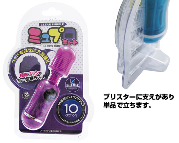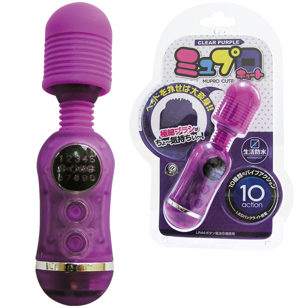 プレイの幅が広がる!2WAYヘッドの多機能ミニ電マ(クリアパープル)。柔らかなタッチを実現したシリコンヘッドは、マットコーティングで汚れにくく、肌触りの良い仕上がりに!コンパクトながらも、10パターンの強力振動を搭載しています。そのまま押し当てたり、ヘッドを外してブラシでのピンポイント攻撃も可能!さらに、暗闇でも操作しやすいLEDバックライトも搭載!生活防水仕様で便利な電マ型ローターです。ボタン電池(LR44)×6個使用。