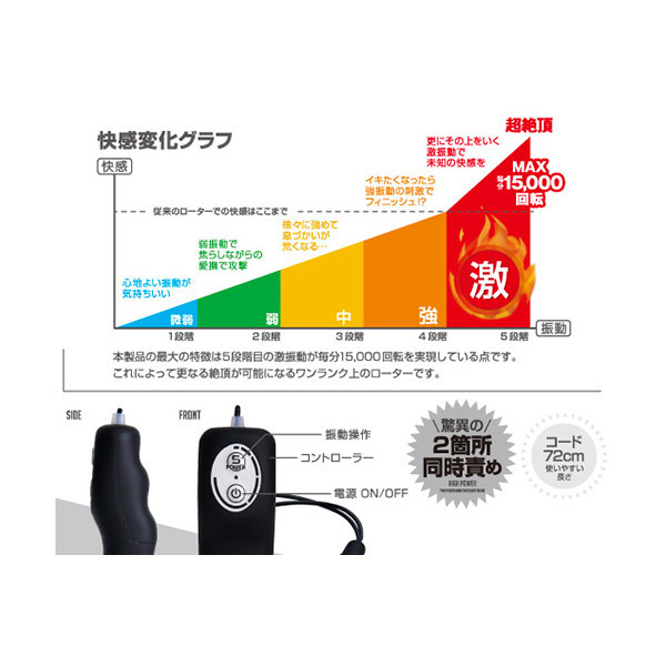 二ヶ所同時責めで一気に昇天!MAX15000回転の超絶振動「激」モードを搭載したダブルローターのビブラル。振動部に付いたシリコングリップを持って操作すれば、激しい振動でも手が痺れにくいので長時間の使用が可能。強弱調節は5段階!機能・操作共にシンプルですので、初心者の方でも安心!生活防水・静音設計のパーフェクトローターです。単四電池×2本付属。