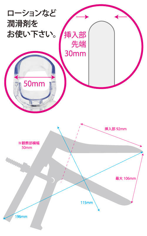奥の奥まで覗いちゃおっ♪秘部が丸見えになっちゃうプラスチック製クスコ。●軽くて丈夫なプラスチック製●ヒンヤリ感がなくソフトな感触●透明なので当たる部分も丸見え●挿入部全長92mm×先端径30mm●最大開閉サイズは約10.6cm●ガッツリ使えるLサイズ。パートナーの秘密の場所をじっくり観察しちゃおう!れっきとした医療器具でありながらSMの世界でも人気の高いクスコ。金属の冷たさが苦手な方でも受け入れやすいプラスチック製ですが、挿入の際は必ずローション等の潤滑剤を使用してお楽しみください。