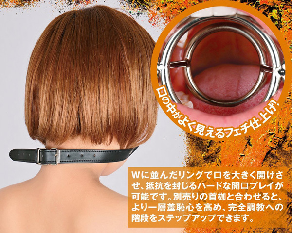 喉奥の粘膜まで視姦!唇と舌を押さえ込むWリング仕様の開口口枷。●鬼調教が楽しめる「調教」シリーズ●唇・舌用の輪を配置したWリング●金属部は安心のステンレス素材●柔らかなフェイクレザーベルト●サイズ調整可能なフリーサイズ●汚れに強くお手入れもラクラク。苦痛と快楽の絶対服従プレイが楽しめる調教シリーズの開口口枷!並んだ二つのリングが口を大きく開けさせて抵抗を封じます。別売りの同シリーズ「首枷(e22507)」と併用すれば、主従関係が明確になるペットプレイも楽しめます。