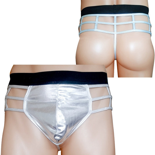 近未来的なデザインがCOOL!まるでショーの衣装のように華やかなキラキラ系男性下着。●シルバーに輝くメタリック風素材●ウエスト部分は幅広ゴムでぐるり●ベース型で覆う立体加工フロント●サイド〜バックにかけてネット状●ストリングのみのSEXYバック。対極にある「隠す」と「見せる」をバランスよく釣り合わせたセクシー下着!目が眩みそうなシルバーのきらめきと肌見せ感で、男の色気をたっぷり引き出します。