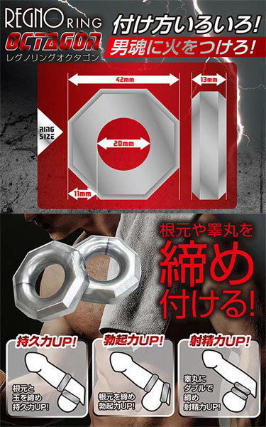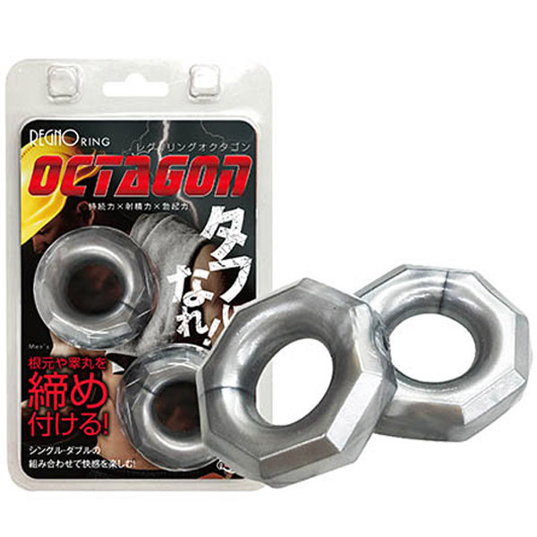 Wリングで男魂に火をつけろ!持続力×射精力×勃起力をサポートするペニスリング2個セット「レグノリング オクタゴン」。●ナット風の八角形リング×2個●本体4.2×1.3cm・内径2.0cm●シングルorダブル使いも可能。装着の仕方次第で様々な効果を発揮!厚みのあるナット形状のダブルリングで根元や睾丸をガッツリ締め付ける男性用補助グッズです。