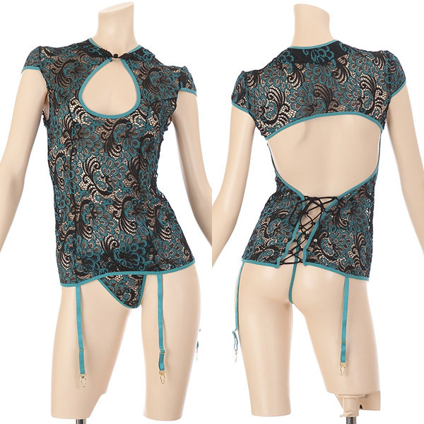 「テティス」とは美しい海の女神という意味です。色鮮やかなエメラルド色が美しい、チャイナに見せかけたベビードールのテティス·シノワ。レースの隙間からのぞく素肌!妖艶なムードを醸し出すオーバル型に開いた胸の谷間。背中側は大胆なカットデザインで、ヒップ上の編み上げも相まって夜の雰囲気を盛り上げます♪ガーターストラップ付きなのでお好みのストッキングとあわせてコーディネートを楽しめます。※セット内容以外は付属しておりません。※濃色の商品は摩擦や水分により色移りすることがありますのでご注意ください。