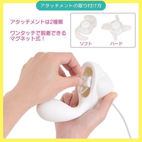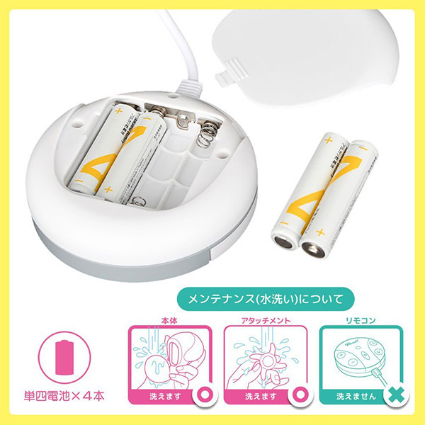 クリをレロレロと回転しながら愛撫する回転ファンとGスポットを圧迫する挿入シャフト、そして異次元の気持ちよさを実現する舌を模したアタッチメントが旋回!回転ファンと振動といった、これまでにない特殊機構による高次元な2点責めは人間技では不可能な快感を堪能させてくれます♪クリに密着する舌型の回転羽根と付属する舌型アタッチメントは2種類!連続的に舐める4枚ショート舌はペチペチと舐めるような感触を、2枚ロング舌はゆっくりとしたリアルな舌の感触を見事に再現。舌型アタッチメントはワンタッチで脱着できるほか、ソフトでやさしい肌触りなのもポイントです♪舌パーツは丸洗いもできるので衛生面の心配もなく、振動強度や回転速度が7段階も調節可能なのもウレシイところ。駆動は単4電池4本ですがパワーも申し分なくアダルトグッズ初心者からベテランまで幅広くお楽しみ頂けます!