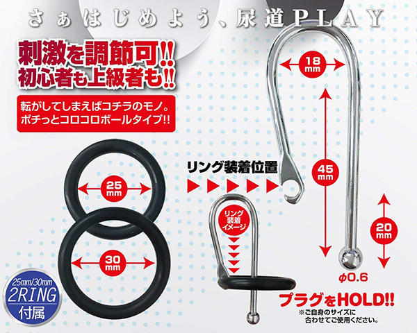 U字型に加工されたステンレス製の尿道プラグです。ショートサイズだから使い勝手が良く、先端部分のボールが尿道を刺激するタイプでリングの大きさは25mmと30mmの2サイズ♪メタル素材だから煮沸消毒ができるほか、耐久性も期待できるので、自分の好みのところへセットできたら、付属のリングでそのまま固定出来るように設計されています。先端部分のボールは直径6mmのため、そこまで拡張はできませんが、ずっと装着していたくなる不思議な感覚が味わえます♪初心者から上級者までお楽しみ頂ける本作品。とはいえ、尿道プレイは危険を伴う場合もありますので、使用の際は無理のない範囲でご使用ください!