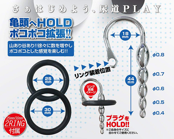 U字型に加工されたステンレス製の尿道プラグです。ショートサイズだから使い勝手が良く、先端部分のボールは4mm径から始まり、1mmずつボコボコが太くなりながら、最終的には8mmにまで達するという5段階の刺激が楽しめるタイプとなっています!リングのサイズは25mmと30mmの2サイズでご自身のサイズに合わせられるほか、メタル素材だから煮沸消毒ができたり耐性があったりと、しっかりとした使い心地が味わえます♪自分の好みのところへセットできたら、付属のリングでそのまま固定できるように設計されていますが、尿道プレイは危険を伴う場合もありますので、使用の際は、商品特性をご理解のうえ自己責任でお楽しみください。