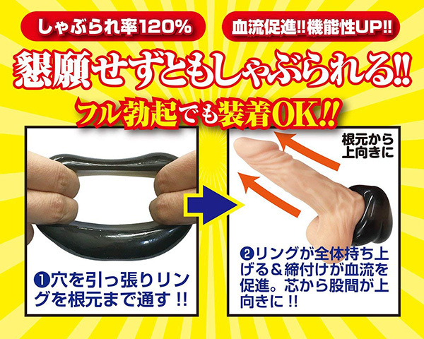 フェラをさせるのに特化した形状のリングです。耐久性と伸縮性の高いエラストマー素材を使っているため、リングの中央に開いた穴を左右に引っ張るだけでフルボッキ状態でも装着可能♪リングをしっかりと根本まで通せるため、しゃぶられ率は120%を突破!根本から上向きにリング全体が持ち上がるので、締め付けによる勃起力アップと同時に血流促進&機能性アップも期待できそうです♪