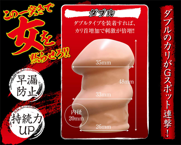自身のカリクビが増加。Gスポットを刺激するカリキャップシリーズ。早漏抑制&持続力アップ!!ダブルタイプを装着すればカリ首増加で刺激が倍増。膣内を満たし、情熱的な一突きで女を黙らせろ!!