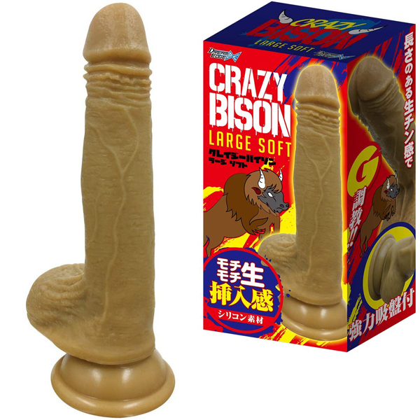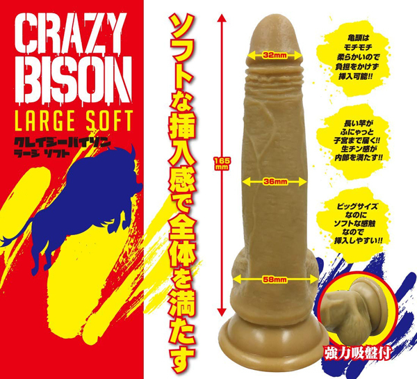 ソフトな挿入感で全体を満たす。内部で暴れるように刺激するクレイジーバイソン登場!!シリコン製で入れ心地なめらか。モチモチ生挿入感で調教!!<ラージソフトの特徴>亀頭はモチモチ柔らかいので負担をかけずに挿入可能。長い竿がふにゃッと快感ポイントまで届く!生チン感が内部を満たす。ビッグサイズなのにソフトな感触なので挿入しやすい。