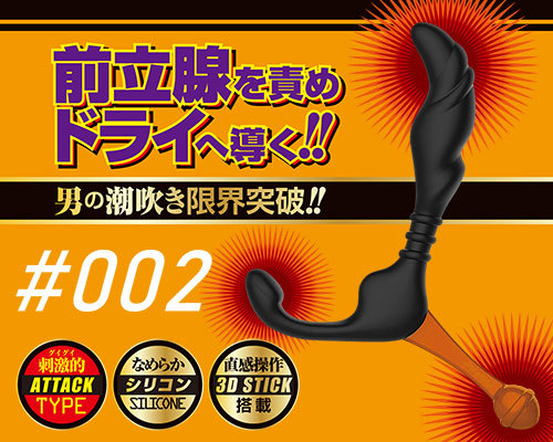 前立腺と会陰を同時に圧迫!究極の快感ドライオルガへ導くアナル用グッズ。安心して挿入できるコンパクトなサイズで、3Dスティックを使ったピンポイントに狙いやすい操作性が魅力!お尻への負担が少なく滑らかな挿入感が味わえるシリコン製で、初心者さんでも無理なくご使用いただけます。002は凹凸形状が刺激的なATTACKタイプ!外から内から刺激して夢の男の潮吹きへ♪