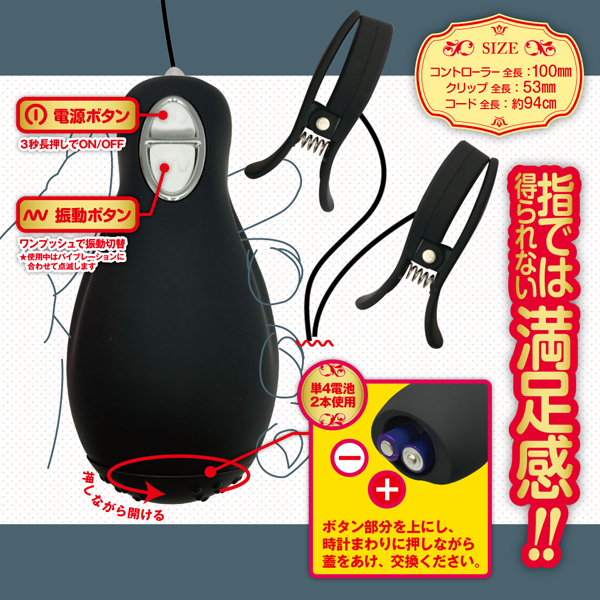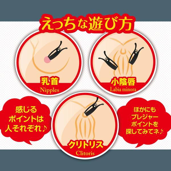 つまむ!悶える!Wの快感!えっちなオトナの必需品♪いつものプレイにプラスするもう1アイテムとしてもオススメ。大きい乳首も挟めるバネ式クリップとプレイに集中できるワンプッシュで簡単操作のコントローラー!カラーは、かわいいピンクとシックなブラックの2色展開!オールシリコンコーティングでお肌にも優しく、それでいてきちんと刺激してくれます。静音性もバツグンなので、こっそりプレイもできるかも?乳首だけでなく、他の場所もつまんで調教しちゃおう♪オールシリコンコーティングで肌にも安心。