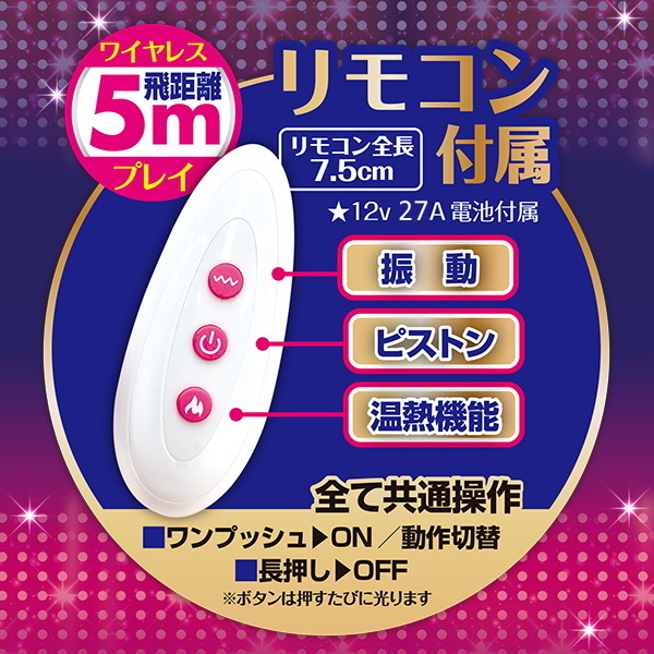 奥まで届く!奥まで響く!もっちり亀頭が挿入しやすく温熱機能搭載のお得なワイヤレスピストンディルド!Gスポット&子宮を激責め!!ひとりでもパートナーとも楽しめるワイヤレスリモコン付き!高品質シリコン製のもっちり亀頭&竿はガッチリ頑丈ストレート仕上げ。さらに人肌温感機能をプラスして本物挿入感を楽しめる。挿入部分が160mmと少し長め&伸縮約10mmで奥イキ派や奥イキ開発におすすめ。3パターンのピストンダンスと多彩な9段階振動。個別に選択が可能なので、もっとも好きな組み合わせを探そう♪プレイに集中できる強力吸盤付き。・温感機能付き・リモコン付属(操作飛距離約5m)・生活防水・USB充電式(充電時間:約2時間/連続使用時間:約1時間)※使用状況や環境により時間が変わる場合があります、本体底部の電源部分には水が入らないようにしてください。※パッケージにはリモコン用電池12V23A付属と記載されていますが正しくは12V27Aです。
