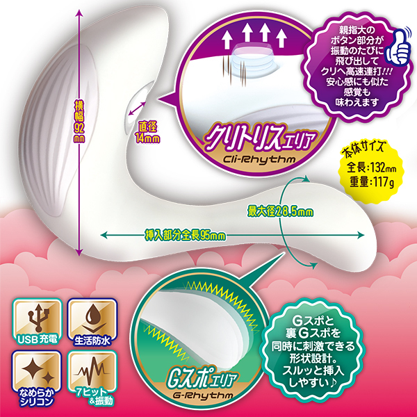 クリオナ革命はじまる!クリトリスにトントン叩く愛撫を!クリ吸引とは違ったキモチよさをエーワンからお届け♪これからは連打の愛撫(クリリズム)でキモチよくなろう♪<クリトリスエリア(クリリズム)>親指大のボタンがクリを高速連打。ゆっくり心地よい連打から超高速連打までの7ヒット。<Gスポエリア(Gリズム)>フレキシブルに曲がり、こぶりで挿入しやすい設計。裏Gスポも合わせて刺激する7振動。なめらかなシリコンコーティングで、白鳥みたいな形がクリとGスポにフィット。遠隔操作できるオシャレなリモコン付き。※クリトリスエリアとGスポエリアの振動は連動しており個別には選べません。※リモコンでは振動のON/OFFはできません、本体でON/OFFを行ってください。充電時間:約150分/連続使用時間:約60分(使用状況や環境により時間が変わる場合があります)
