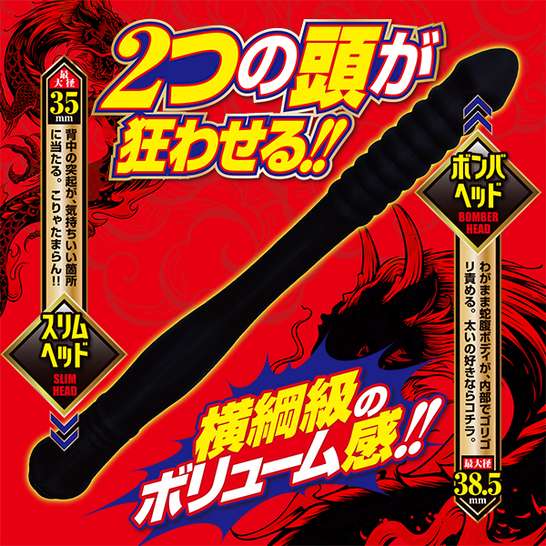 アソコもアナルも男も女も!!2穴同時に責めまくれ!!横綱級の圧倒的な挿れ心地。全長41cmだから、1人で2人で奥まで届く。2つの頭を巧みに手懐け、ガンガンにイキ狂おう!<ボディ特徴>ボンバヘッド…わがまま蛇腹ボディが、内部でゴリゴリ責める。太いの好きならコチラ。スリムヘッド…背中の突起が、気持ちいい箇所に当たる。こりゃたまらん!!