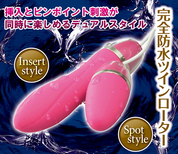 なんと30分間水没させても浸水しないという、国際基準IPX7をクリアした驚異の防水性能を誇るダブルローターです。挿入して楽しめるインサートスタイルと、ピンポイントに当てて楽しめるスポットスタイルのヘッドは、それぞれ形が異なるのでクリに当てながら挿入したりといった使い方も可能♪振動パターンは10種類でトルクフルな強力振動はきっとクセになること間違いなし!肌触りの良いさらさらマット加工は、女性が心地よく感じること請け合いで、最新技術のウォーターシールド加工が施されているから、本体もコントローラーも水に入れても浸水しませんよ♪こちらは人気のピンクカラーになります。※単四電池×2本付属