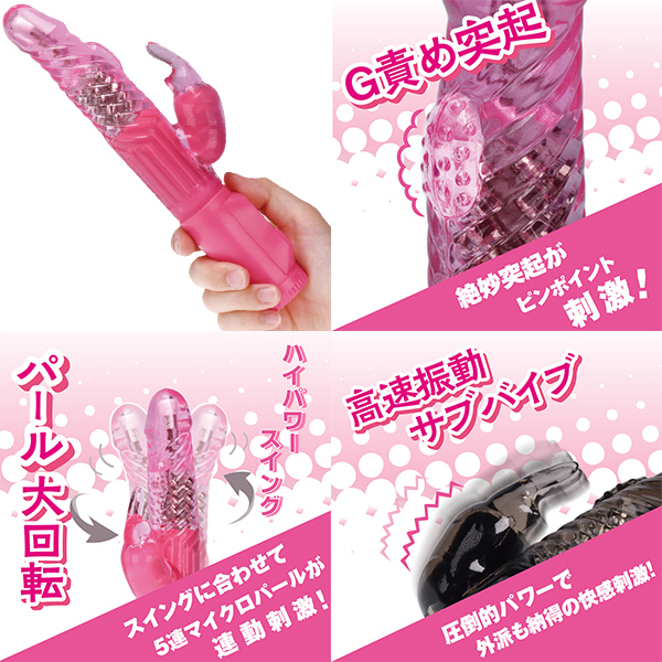 ハイパワースイング&サブバイブ振動にストレス臭カットの高品質TPE素材採用のジャストサイズバイブ登場。最大径30mmのジャストフィット形状に挿入部から約50mmの部分に絶妙に配置されたGス●ットしげき突起を配置・グルグル刺激するパール回転アクションも搭載。使い易いみんなのスタンダードバイブ。カラー:ピンク