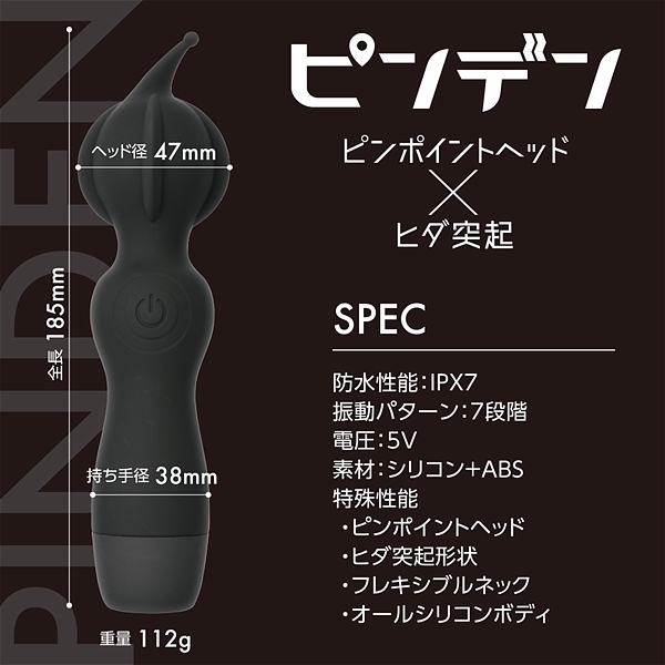 ピンポイントヘッド・ヒダ突起付の完全防水シリコンデンマです。上質振動の強力モーター搭載・高品質シリコンボディ・フレキシブルネックの上級性能に加えてピンポイントを強力刺激出来る先端突起と割れ目に入れて楽しめるヒダ突起形状をプラスしました。振動も一般的なパターン振動では無く、こだわりの強弱微調整可能な7段階振動です。もちろん普通のデンマスタイルも可能なので色々な楽しみ方が出来ます。しかもIPX7の完全防水性能だから使い勝手もバツグンです。90分満充電で60分使用可能(使用環境により大幅に増減します)なリチウムイオン電池内蔵。パワフルなのに繊細な使い方も楽しめるデンマです。●カラー:ブラック