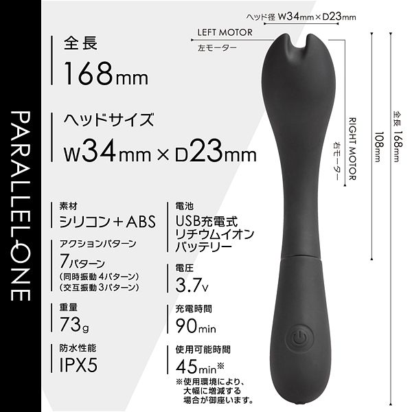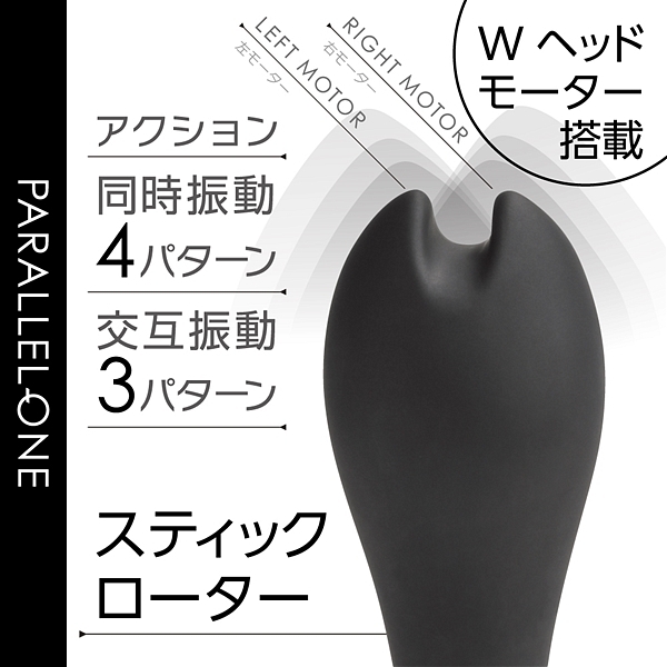 先端に並列で2つのモーターを搭載して、個別に振動させる事が出来るツインモータースティックです。滑らかな肌心地のシリコン素材と振動の質にこだわったモーターを2機搭載。プレジャースポットに合わせた角度と日本人に合ったサイズ感が特徴です。先端は挟んで刺激も出来るように溝を付けています。先端振動は同時振動・個別振動合わせて7パターン。90分充電で最大45分使用可能(使用環境により大幅に増減します)なパワフルなリチウムイオンバッテリーを搭載。IPX5の高レベル防水でしっかり洗えて衛生的です。スマートに振動を楽しめるWモーターヘッドスティックです。●カラー:ブラック