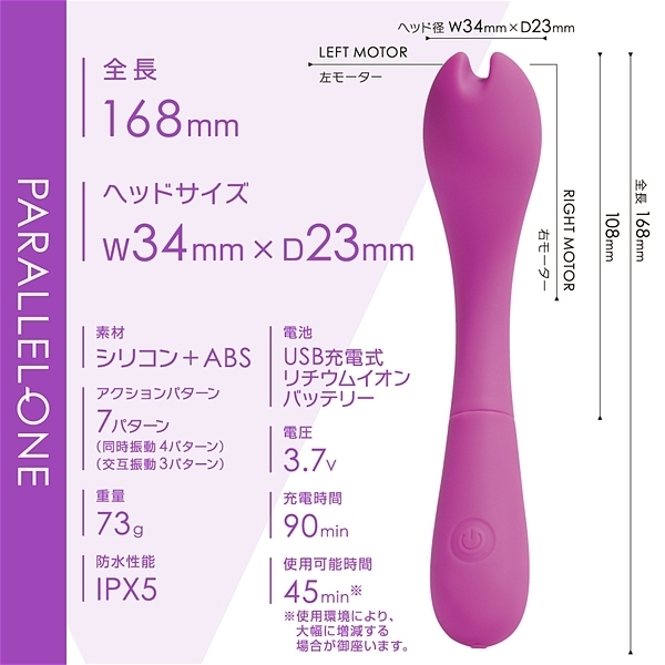 先端に並列で2つのモーターを搭載して、個別に振動させる事が出来るツインモータースティックです。滑らかな肌心地のシリコン素材と振動の質にこだわったモーターを2機搭載。プレジャースポットに合わせた角度と日本人に合ったサイズ感が特徴です。先端は挟んで刺激も出来るように溝を付けています。先端振動は同時振動・個別振動合わせて7パターン。90分充電で最大45分使用可能(使用環境により大幅に増減します)なパワフルなリチウムイオンバッテリーを搭載。IPX5の高レベル防水でしっかり洗えて衛生的です。スマートに振動を楽しめるWモーターヘッドスティックです。●カラー:パープル