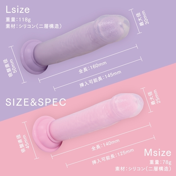 芯のある安定感と柔らかな外層を兼ね備えたリアル仕様のディルドです♪全長約16cm、挿入可能長は約14.5cmで、しっかり届くサイズ感が特長です!中は硬めの芯素材、外はぷにっとした柔らかさでリアルな触感を追求しています♪特殊なシリコン素材を採用し、安全性と肌なじみの良さを両立しました!底面には強力な吸盤が付いており、壁や床にしっかり固定して使えます♪ズレを気にせず自分のスタイルで楽しめるのが魅力です!しっかりとした構造で安定感があり、初心者から上級者まで幅広く対応します♪落ち着いたパープルのカラーが上品で大人っぽい雰囲気を演出します!使うたびに手に馴染む心地よさがクセになるアイテムです♪快適なセルフケアタイムをサポートする、頼れる一本として活躍します!ビジュアルと機能性を兼ね備えた満足感の高い一品です!