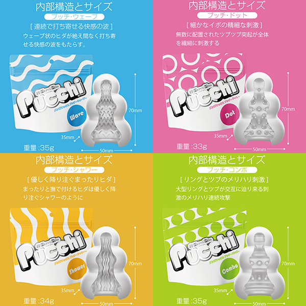 全てが新しくなったプッチ。ポケットサイズのローション不要ホールプッチシリーズが生まれ変わって新登場。軟性素材から内部の構造、パッケージ、全てが新しくなりました。デコボコ感、さらにクッキリ。今回新たに導入した「HD(High Definition)成形」で突起のデコボコ感がさらにクッキリになりました。突起に触れたときの粒立ちが違います。弾力感、さらにモッチリ。「HD 成形」により軟性樹脂の弾力性も向上。さらにモッチモチに、しなやかな素材になりました。内部構造も、さらにハッキリ。オリジナルシリーズ、スイーツシリーズ計8種類の内部構造をより精密な造形にリニューアル。「HD 成形」とあいまってデコボコ感がよりハッキリわかる構造になりました。生産工場を一新。新型プッチシリーズは日本国内に新設した工場から生産。最新の設備と厳密な品質管理で一つ一つ丁寧に作ります。ローション不要、必要なのは水だけ。ローション不要軟性素材「プラスウェッチ」水分が付着すると潤い成分が反応、ねっとりした潤いに包まれます。<ウェーブ内部構造>「連続で打ち寄せる快感の波」ウェーブ状のヒダが絶え間なく打ち寄せる快感の波をもたらす<ドット内部構造>「細かなイボの精細な刺激」無数に配置されたツブツブ突起が全体を繊細に刺激する<シャワー内部構造>「優しく降り注ぐまったりヒダ」まったりと撫で付けるヒダは優しく降り注ぐシャワーのように<コンボ内部構造>「リングとツブのメリハリ刺激」大型リングとツブが交互に迫り来る刺激のメリハリ連続攻撃