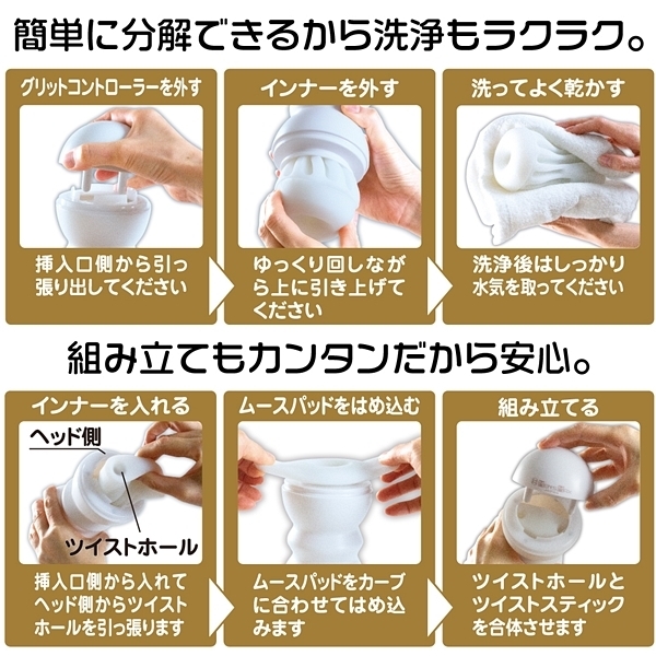 グリットコントローラーは右にも左にもツイスト可能。右と左のひねる方向で内部構造も変化する!お好みのひねり具合で吸着感をコントロール!挿入口のキャップを外しローションを入れて挿入。グリットコントローラーを右に左にねじって刺激の変化を体感せよ。インナーは丸洗い可能。各パーツを取り外し、洗浄・乾燥が終わったら組立てて再び使用可能。アウターケースは耐久性に優れ表面のマット仕上げとフォルムで安心のグリップ感。インナーは約250gで単体のみでの使用も可能なずっしりサイズ。ポケットローション(7ml)付属。グリットコントローラーに付いたスプリングボールとギアカルーセルがかみ合いスムーズな操作性を実現。グリットコントローラーは右にも左にも回せます、右と左のひねる方向で内部構造も変化する!お好みのひねり具合で吸着感をコントロール!<内部構造>@グラインドスクリュー 掘削機をモチーフにした最奥ゾーンAツインスクリュー 2種類の縦型スクリューで締め上げるBビッグスクリュー 肉厚なスクリューが根本をホールド