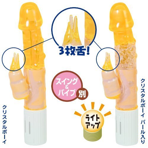 人間工学に基づいた昇天必須の快感バイブ「クリスタルボーイパール入り ピンク」。本体内部に贅沢なパールを内蔵し、使用時にはその部分が怪しくライトアップ!カリの直径約3.8cmと巨根マニアの方も納得!子機も3枚舌仕様と抜かりなし!さらにスイングとバイブの個別動作が可能…と、見た目と性能どちらも兼ね備えた次世代バイブ!