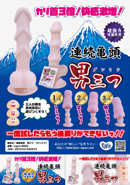 3つの亀頭で快感倍増!連続刺激が気持ちいい吸盤付きディルド。三人の男を同時に受け入れるような感覚に興奮高まる♪少し細めの程よい大きさで気軽に使いやすいサイズとなっています。壁や床にしっかり張り付く超吸着力でディルドの力を最大限発揮!