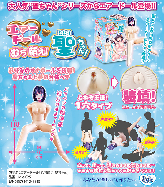 超リアルエアドール「むち萌え!聖ちゃん」の登場です!匂い系グッズで人気の、聖(ひじり)ちゃんがエアドールになりました♪むちむちのボディで恥ずかしそうな聖ちゃんの笑顔がたまらない!顔全体がしっかりと違和感なく収まっていて凛々しいエアードールへと仕上がっています♪空気を注入すると後ろ手にM字開脚したポーズになり、王道の1穴タイプでお好きなオナホを装填したら、いざ聖ちゃんと合体へ!体位は正常位からバック、さらには斜めに交わる事も可能でホールは小型から中型ぐらいまでなら装着可能♪肌はビニールっぽくない触り心地で少しマットな感じもグッド!蕩けそうな恥じらいフェイの可愛い聖ちゃんをたっぷりと体感してください♪浮き輪を作っている工場制作なので、頑丈で安心ですよ!