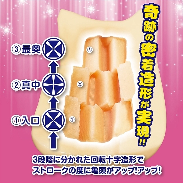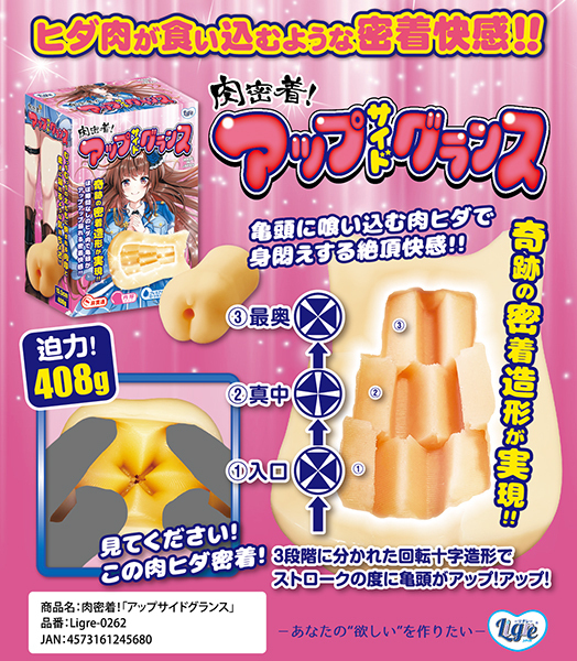 完全密着!肉密着!「アップサイドグランス」の登場です!見て下さい!この肉密着!ほとんど隙間がないぐらいの奇跡の造形!入り口から十字、そして徐々に回転していき角度が変わる!そこを押し込むように挿入していく。軌道がずれて快感が変わる!常にヒダ肉が食い込んでいるような密着快感!抜き時にはカリの部分に十字の回転肉密着ヒダが食い込む!気持ち良すぎて、もう手が止まらない!ストロークが止まらない!3段階に分かれた回転十字造形は、その度に亀頭がアップアップ!