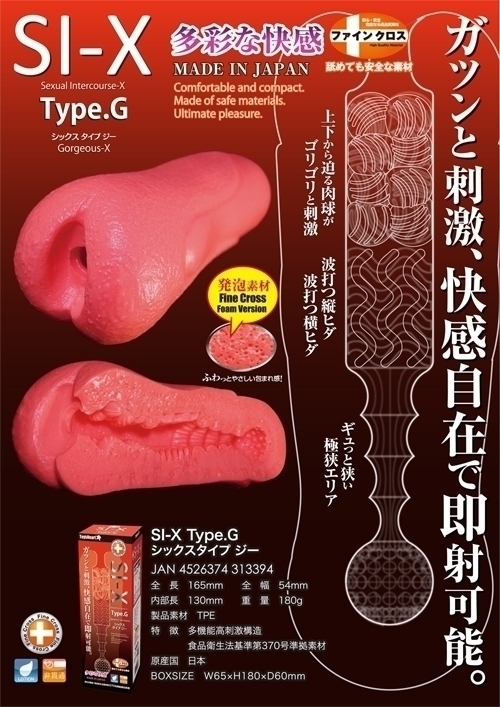 フワッと独特な発泡素材が人気の「SI-X」シリーズから新作登場!ゴージャスなセックス感を味わえるオナホール「Type.G」非貫通型。肉球のような大きめイボ・粒状イボ・細ヒダ・波型ヒダなど、様々な形状による異なった快感を楽しめる内部構造。ホールを回転させたり、挿入具合やストローク加減によって、多彩な刺激を堪能できるオナホールです。