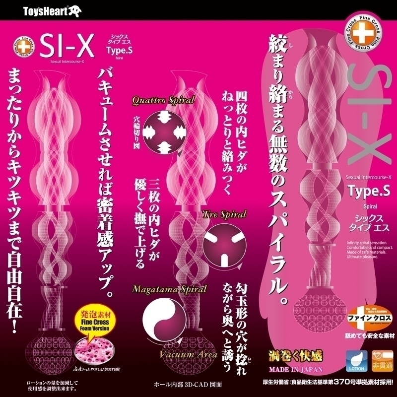驚異的な人気を誇るSI-Xシリーズに新作が誕生!その名も「SI-X Type.S(シックス タイプエス)」。高品質の発泡素材「ファインクロス」を使用した、ふわっふわの本体内部には4つの仕掛けが!まず前半部分では、肉棒に絡み付き優しく撫で上げるような感触を。後半部分では、勾玉形の穴と無数のイボイボが亀頭を集中攻撃!気分が最高潮な時にフィニッシュを迎えられます。また、まったりからキツキツまで刺激を自由に変えることもポイント。これひとつで何通りもの刺激が味わえる贅沢なオナホールです。ローション付属。