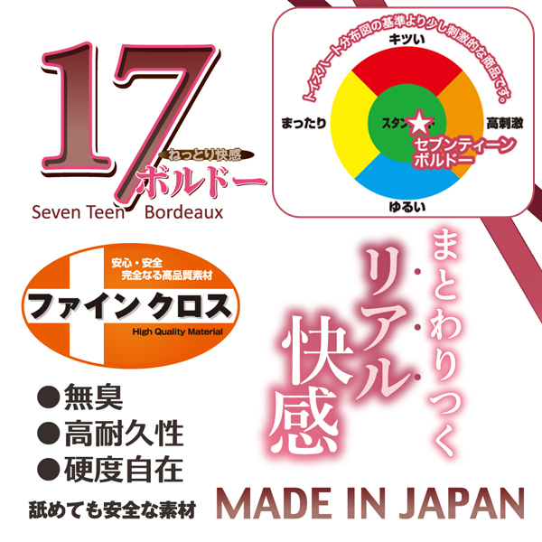ついに登場!大人気セブンティーンシリーズの第3弾オナホール「セブンティーン ボルドー」。今作は外部にふわふわ素材、内部に超ねっとり素材を使用!2層構造が織りなす、濃密なフルボディが特徴です。また、シリーズで好評のリアルなオマ○コ内部&子宮もモチロン健在!内部には丸みのある凹凸を加え、より刺激のある形状に仕上げました。ねっとりとまとわりつく、リアルな挿れ心地を堪能できるオナホール(非貫通型)です。※製造時期によりパッケージのデザインが画像と異なる場合が御座いますが中身は同じです。