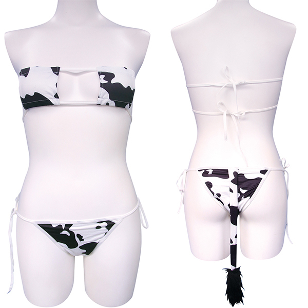 大胆でセクシーな牛柄コスチュームで野生の魅力を解き放て!あなたの中のメス牛が疼きだす、露出度高めの眼帯ビキニとしっぽ付きの紐ビキニショーツ。●メーカー型番:TMT-1711