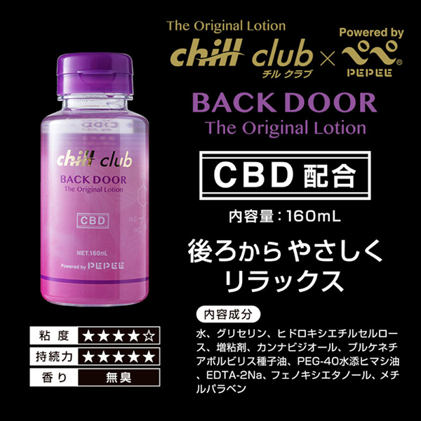 いま話題の成分「CBD」を配合した優しい肌触りのローションです。大人気ブランド「ぺぺ」とコラボレーションした安心安全の日本製ローション♪BACKDOORはバックプレイに最適な使用感を持っています。最適な潤滑力に粘度と持続力!バック特化型の使用感でゆったりとリラックスしたバックプレイをお楽しみいただけます。色は無色透明で味・匂いもありません。本製品はしっかりとした生産管理の元、ヴァージンキャップを採用。安心と安全をお約束致します♪※CBDとは大麻草などに含まれる成分のひとつで、そのリラックス感が人気となり、欧米をはじめ世界で話題となっています。精神へ与える作用や中毒性がないことで知られており、医療や健康・美容業界から注目を集める成分です。CBDは、大麻草の成熟した茎および種子から採取された成分で、いわゆる違法大麻と違って、ハイになったり酩酊状態を引き起こす効果はないので、合法になっています。<成分>水、グリセリン、ヒドロキシエチルセルロース、増粘剤、カンナビジオール、プルケネチアボルビリス種子油、PEG-40水添ヒマシ油、EDTA-2Na、フェノキシエタノール、メチルパラベン