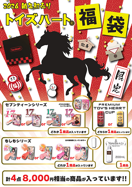 総額8000円相当!大人気のトイズハート製品をたっぷり詰め込んだ超豪華な福袋を、完全数量限定【2700円】で販売中です。オナホール3点とローションが1点、どんな商品が届くかは開けてからのお楽しみ♪特製バッグに詰めてお届けします。こちらは大サービス商品の為、ご注文はお一人様1袋限りとさせていただきます。