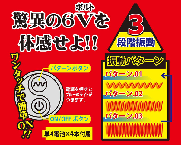 ボタンもワンタッチの簡単操作でシンプルに楽しめるブラックカラーのローターとなっております♪簡単な操作でパワフルな快感!6ボルトの振動を手軽に楽しめるシンプルなシングルローターで、振動パターンは強弱3パターンを内蔵。シンプル構造のシングルローターだから、どなた様でも手軽に6ボルトの振動をお楽しみいただけます♪