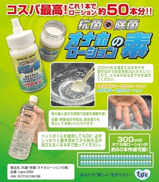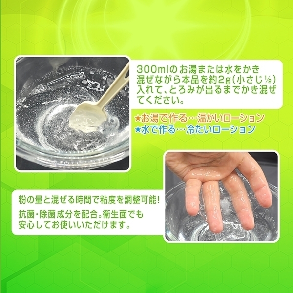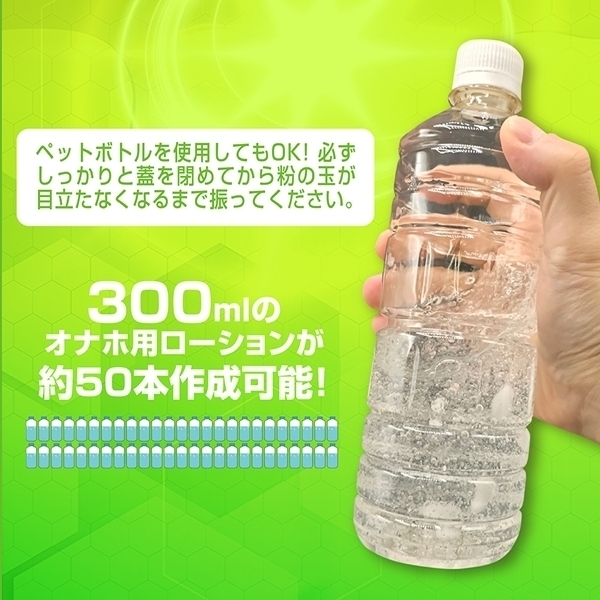 水に溶かして使うパウダータイプのローション原料です!1本で300mlのローションが約50本分も作れます♪必要な分だけ作れるから、いつでもフレッシュな状態で使用可能!作り方は、水やお湯に少しずつ粉を入れてかき混ぜるだけ♪お好みの粘度に調整できるので、使い心地も自分好みに仕上がります!抗菌・除菌成分を配合しているため、衛生面にも配慮されています♪高コスパながら、品質と清潔さを両立したアイテムです!持ち運びやすいコンパクトなボトルサイズで保管もラクラク♪日本国内で製造されており、品質面も安心です!成分はポリアクリル酸Naや重炭酸Naなど、安全性に配慮されたものを使用♪必要な分だけ作れるから、無駄も出にくく経済的です!コスパ重視で、清潔に使いたい方にぴったりのローションの素です♪