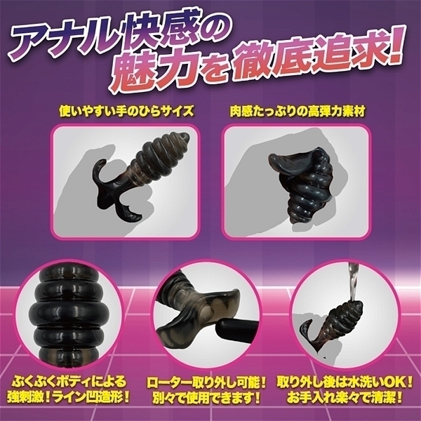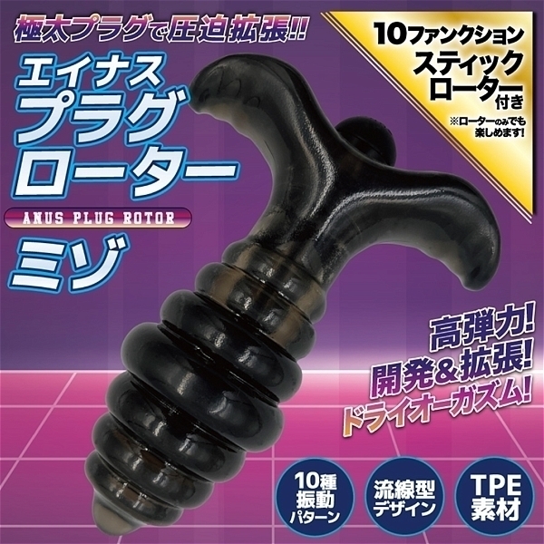 開発!拡張!圧迫!アナル快感の魅力を徹底追求!アナルプラグに振動10アクションをプラスした、「エイナスプラグローター」!オンオフできるよう取り外し可能なスティックローターで、振動アクション10パターンを搭載。ローターを取り外せば、本体は丸々水洗いが可能。肉感たっぷりで高弾力なTPE素材を使用。「ANUS」の名の通り、ファンタスティックな快感をご体験ください。●ミゾタイプ
