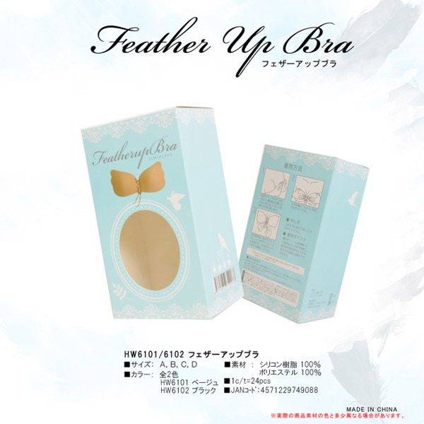 寄せて上げて谷間もメイク♪天使の羽型シリコンブラ「フェザーアップブラ ブラックA」。羽のようなカップがボディに馴染みやすいブラックカラーのモールドブラ!カップ内側は粘着シリコン樹脂、外側はサラリとした肌触りのポリエステル素材です。中央はアジャスターで自在に調整できる編み上げ仕様!胸のボリュームを強調したい場合は少し上目で着用し、紐を持って留め具を上下させるだけで自由に谷間をメイク出来ます。【着用方法】両手でカップを外に向けて反らし、最適な位置にあわせてから外に反ったカップを胸の方向に戻して、ふちが胸につくように指先でなぞって下さい。左右着用後、両手でカップをしっかり押さえて定着させ、留め具をスライドしてお好みで調整して下さい。粘着効果が薄れた際は、一度水洗いし乾燥させてから再度着用して下さい。※サイズは画像を参考にお選びください※通常よりワンサイズ小さめが綺麗に着用できる目安です※Bサイズ(h00037)もございます
