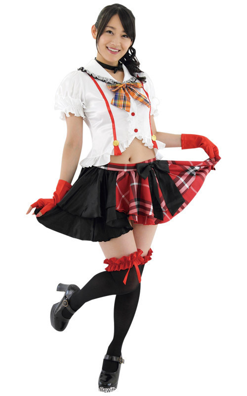 フリル&レースでゴージャスに!ヘソ出しデザインがちょっぴりセクシーなアイドル風のコスプレ衣装。ブラウスはたっぷりフリルで仕上げた乙女なデザイン!胸元リボンとスカートにチェック柄をプラスしたワザありコスチュームです。※靴下は付属しません