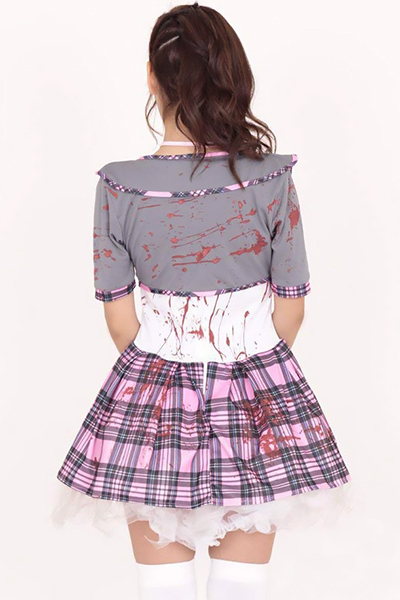 思わずキャーッと叫んじゃう、こわ〜いゾンビ風セーラー服コスチューム。●グレー×ホワイト×ピンクチェック●ワンピース・ボレロ・ネクタイのお得なセット●ボリュームたっぷりのパニエ付きスカート●血痕プリントがリアリティ満載。この姿を見た瞬間、誰もが絶叫!仮装パーティーやイベントにオススメのホラーコスプレ衣装です。※こちらの商品は受注発注商品の為、ご注文から発送まで2〜3営業日掛かる場合が御座います。