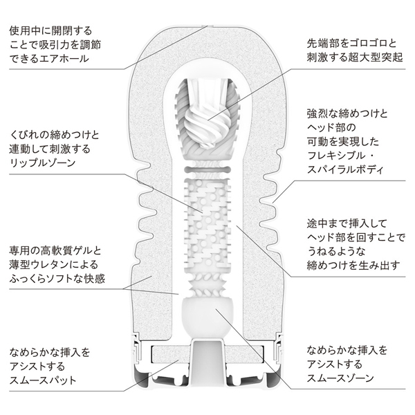 「ローリングヘッドカップ」は、力強い締めつけを生み出すフレキシブルなスパイラルボディと内蔵された大きな突起が特徴。本品は高軟質ゲルと薄型のウレタンによる柔らかな心地よさと、撫でるような先端刺激が味わえるソフトタイプ