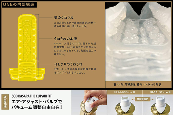 うねるコブ付きヒダが裏スジに絡みつき刺激する!予測不能な快感がたまらないスジ特化型構造。無段階に空気調整ができる新機構エアアジャストバルブを搭載した「SOD BASARA」シリーズ!奥行12.5cmと奥突きできる独自設計で、素材には包み込まれるように気持ちいい最高級ウレタン採用。挿入部周辺のボリューミークッションで下腹部まで心地良い◎重量156g