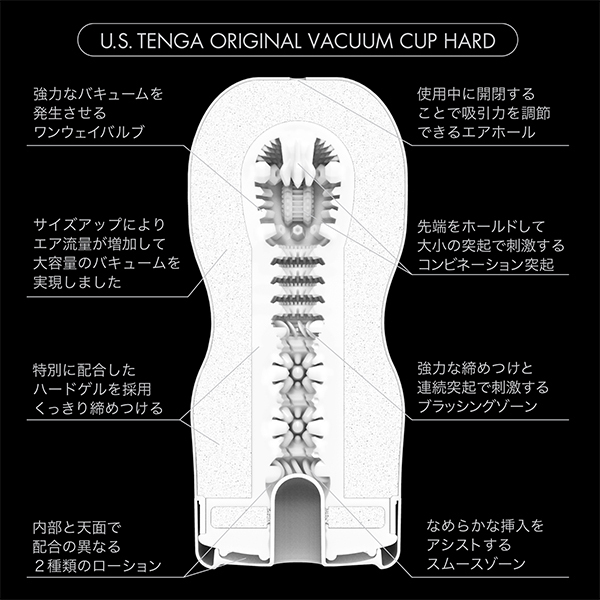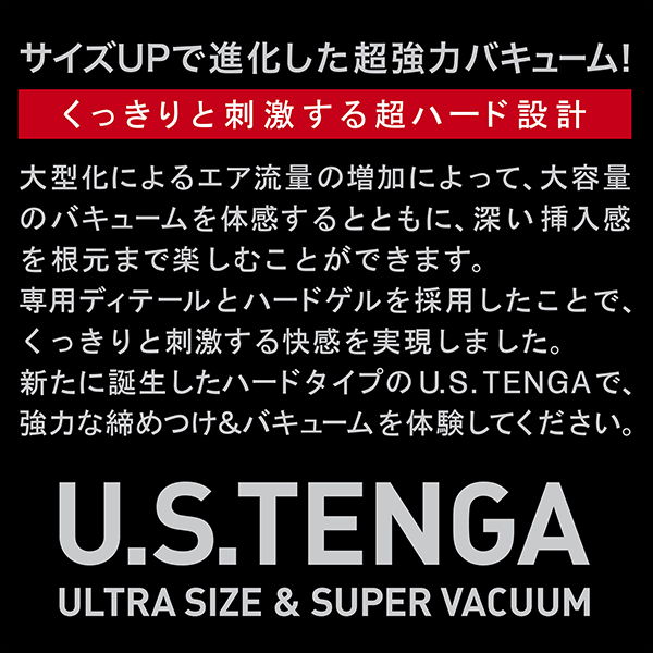強めのバキュームとゆったりした挿入感が特徴の「US TENGA」が待望のリニューアル!ノーマルサイズのテンガより約1.6倍の体積に設計されているため違いがハッキリわかります♪完全リニューアルされたラインナップは3種類。こちらのハードタイプはくっきりと刺激する超ハードな設計が特徴!挿入すると小判型のヒダリング、中央に集中する突起ゾーンによる2連続配置がしっかりと感じられ、くびれ部分ではキュッする締め付けとブラッシングがカリを刺激してくれます♪さらにそこから4連続のヒダリングと大小の突起で刺激するコンビネーション突起が襲いかかり、最奥部分では壁に配置された突起やギザギザした大型突起、突き当りの突起が尿道をピンポイントで刺激しながら超強力な締め付けとバキュームを楽しませてくれます。♪これまでのテンガでは味わえないまったく異なる刺激と快感。再設計されたディテールによるダイナミックな快感をぜひお楽しみ下さい!内部と天面にはそれぞれ配合の異なるローションが充填済み。使いたいときにすぐにお使いいただけます!