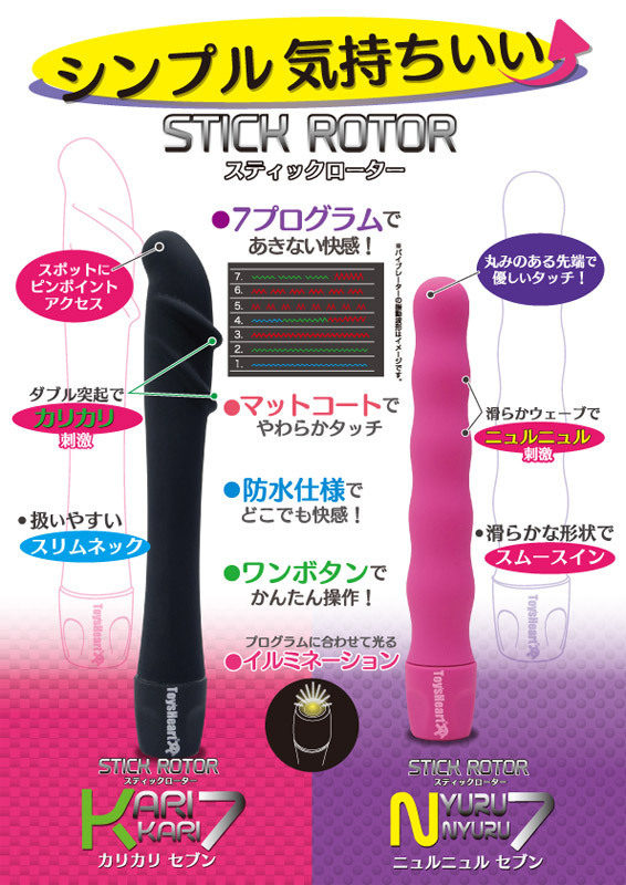 あの有名なアダルトグッズ社「トイズハート」から発売された、防水のスティック型ローター「カリカリセブン」。本体の挿入部・グリップ部に、マットコート素材を採用!長めのスリムボディには、7パターンの振動と連動するイルミネーションを搭載!先端がクイっと曲がっているので、Gスポットやその他の性感帯をピンポイントで刺激!また、背側の突起で内部をしっかり擦ることも可能なので、想像以上の高刺激が期待できます。シンプルな見た目なのに、強力振動を発揮する防水仕様のスティック型ローターです。単三電池×2本付属。