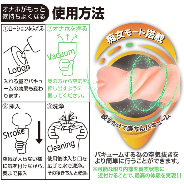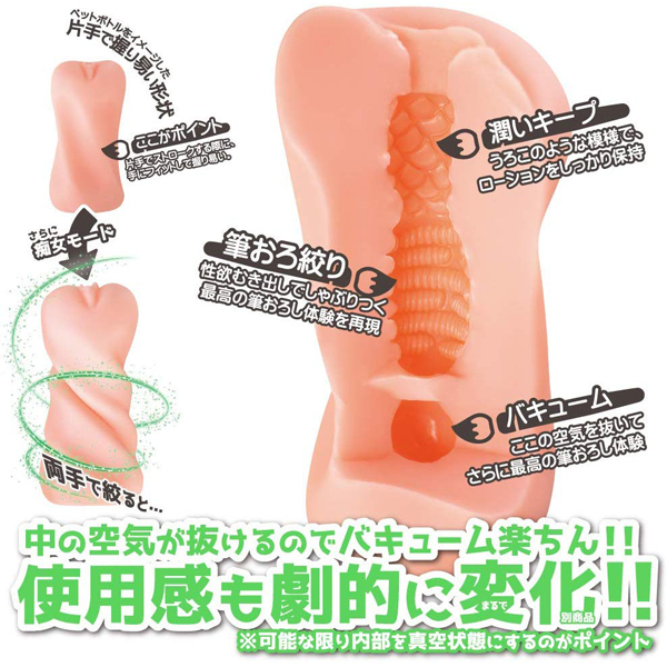 強力バキュームで貴男の精を搾り取る!家庭教師のお姉様が繰り出す、強烈絞り上げバキュームが自慢の痴女感たっぷりな非貫通オナホ。絞るだけで簡単に強力吸引!可能な限り内部を真空状態にすることでこれまでにない快感が得られます。片手で握りやすいペットボトルのような形状も相まって使い心地は抜群!日本製の高品質素材を使用していて、特有の素材臭と油分も極限まで抑えられています。