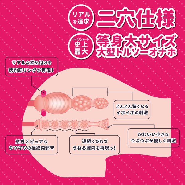 本物以上の満足感がここにある!トイズハート史上最大の等身大サイズ、95cmのむっちりとしたデカ尻がたまらない10kgの超肉厚な据え置きオナホ。後ろの穴から前の穴まで精巧に作り込まれたリアル造形仕様で揉み心地抜群!好みの下着を装着させるなど着せ替えも可能で、対応できる体位は6種類と豊富♪素材は柔らかくハリのあるエラストマーを使用。※こちらの商品は受注発注商品の為、ご注文から発送までに3、4営業日掛かる場合が御座います。